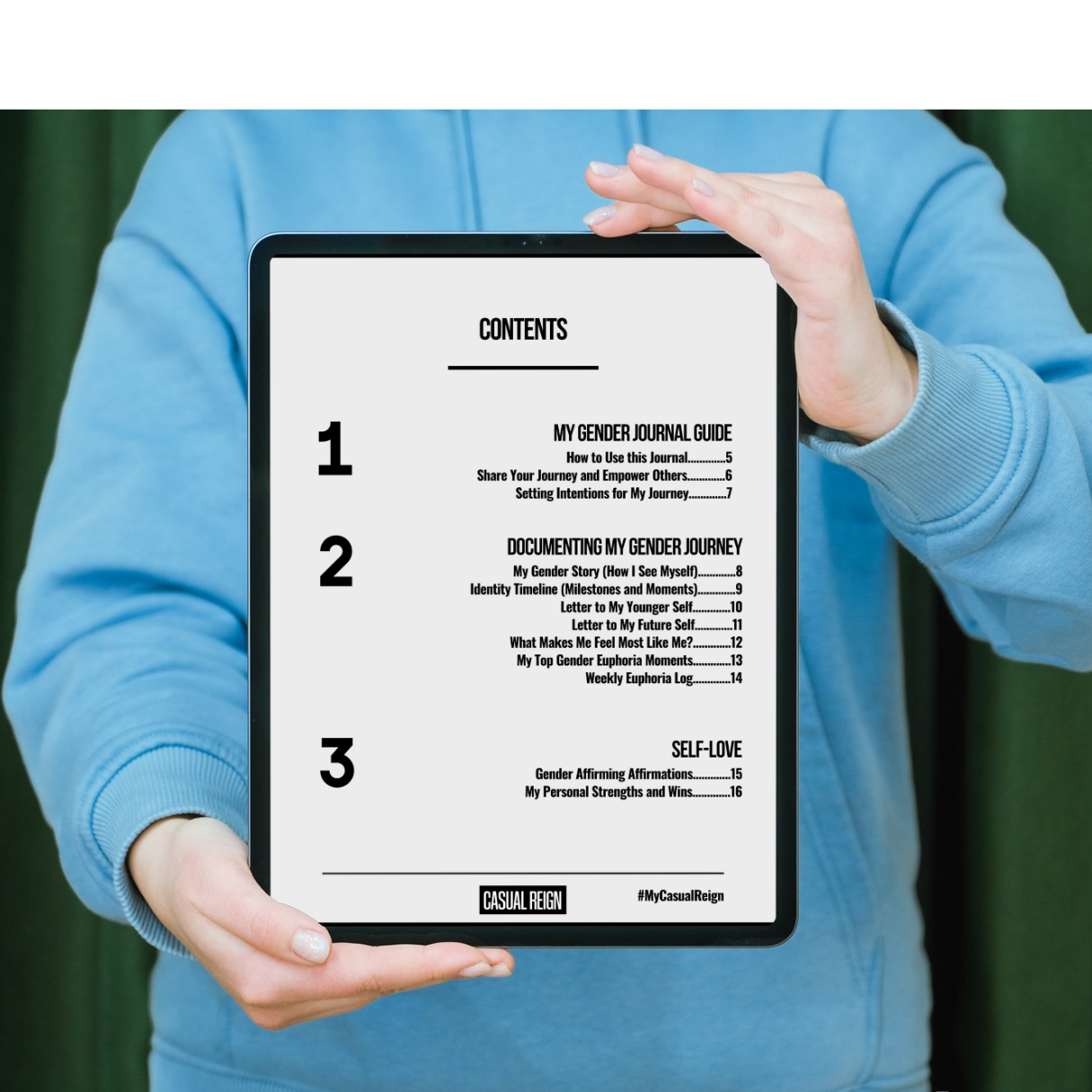 The Casual Reign: My Gender Journal is more than just a journal - it’s a guided space to explore who you are, reflect on your journey, and document the moments that bring you gender euphoria. Whether you’re early in your transition or have been on this path for years, this journal was created to support you in showing up as your most authentic self.